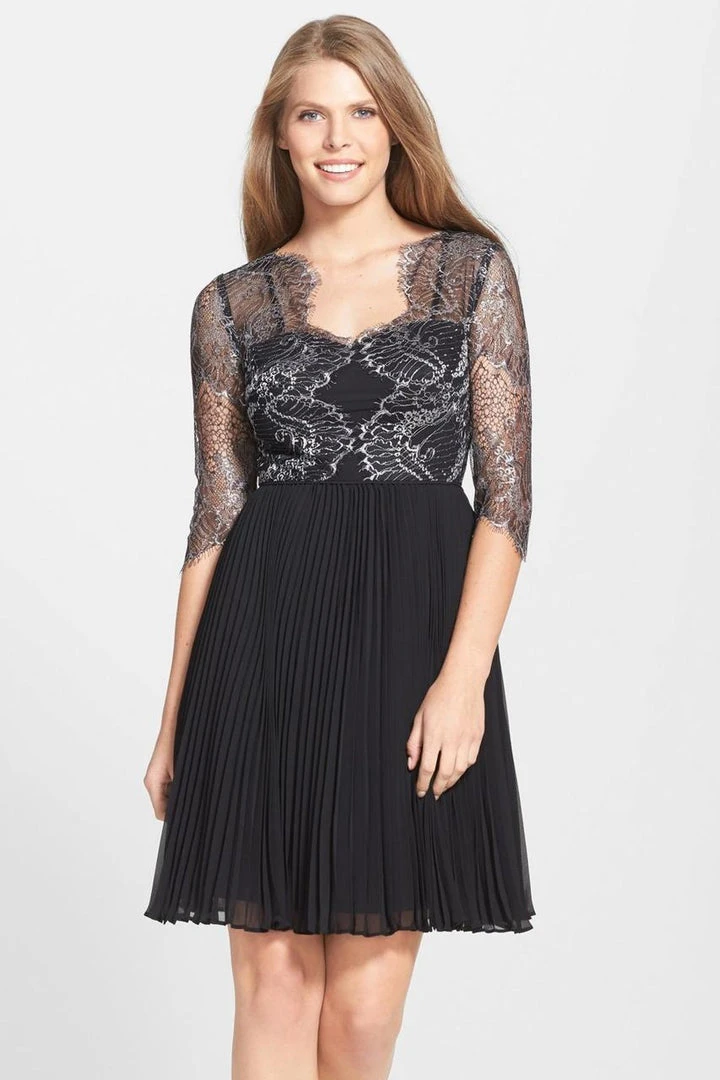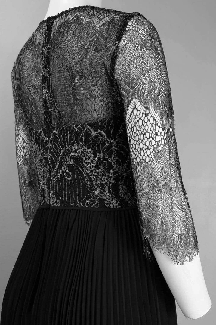 | Details: | Scalloped V-Illusion Neck, Sheer Quarter Length Sleeves, Pleated Skirt, Back Zipper Closure |