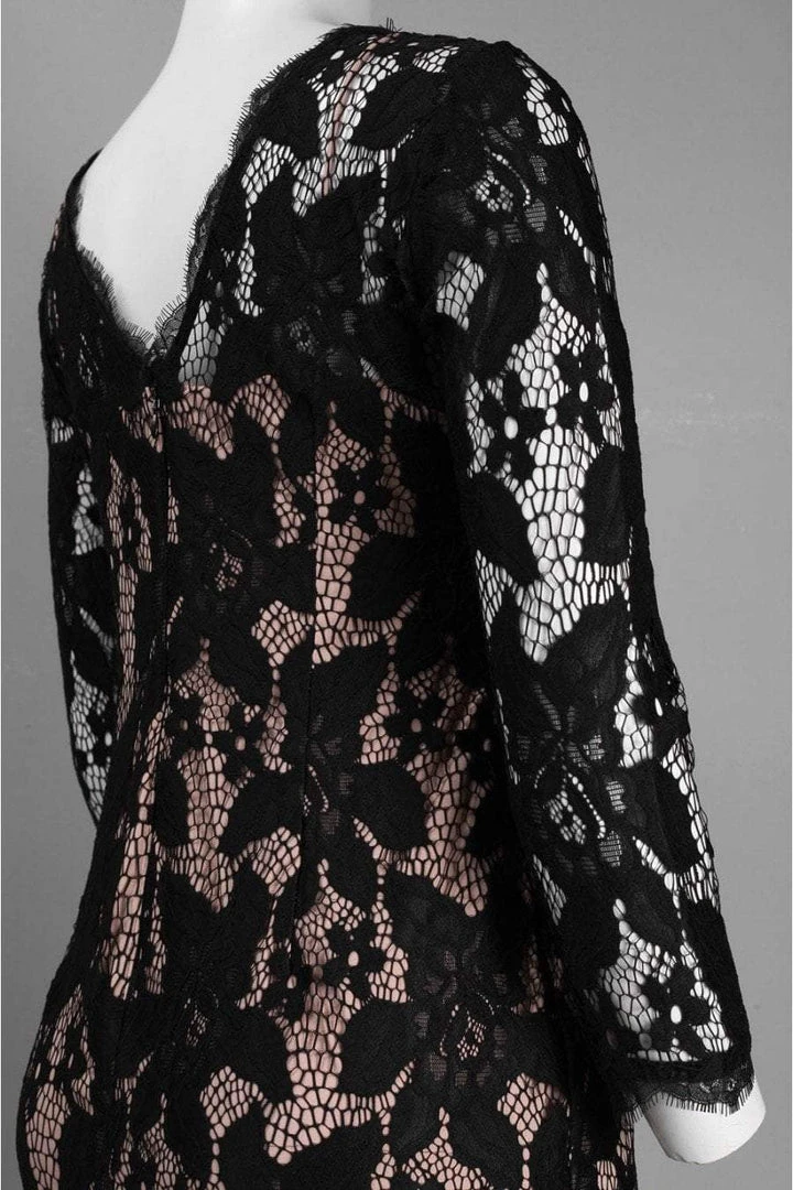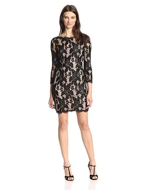Be chic and classy in this little black dress by Adrianna Papell 41895510. This eveningwear classic features crochet lace overlay fabric over nude lining, designed in a quarter length sleeve ??? sheath silhouette. Features a high bateau neckline and V shaped back with concealed zipper closure at the center. Wear this fitted cocktail dress by Adrianna Papell with swept up hair to showcase the sensational romantic allure!
