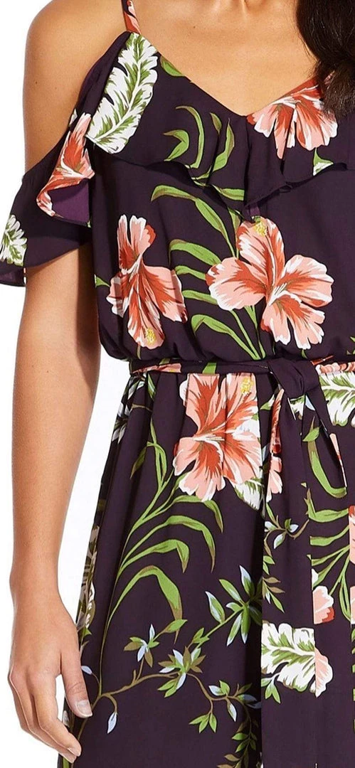 Show off your trendsetting style when you wear this look by Adrianna Papell AP1D103372. This floral print look delights in a V-neckline with spaghetti straps and off-shoulder straps. The bodice is styled with a ties waist and features a pair of long loose leg pants. Dress to impress with this Adrianna Papell style.