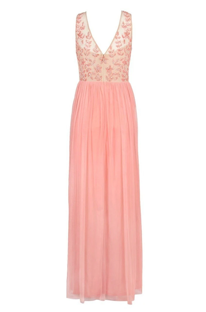 Details: Sleeveless, Fitted bodice, Sheer fabric, Sweetheart lining, Bead embroidery, A-line skirt, V-back, Back zipper