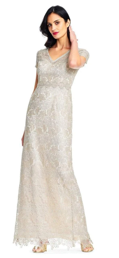 Display your natural beauty in this elegant evening dress by Adrianna Papell AP1E202688. Tailored in lace, this gorgeous evening gown offers a fitted bodice framed with a V-neckline and short sleeves. This gown tapers to a full length hemline with a sheer full back. A center zipper closure secures the back as it flaunts a slit that enables an ease of movement. This Adrianna Papell ensemble is perfect on your next formal event.
