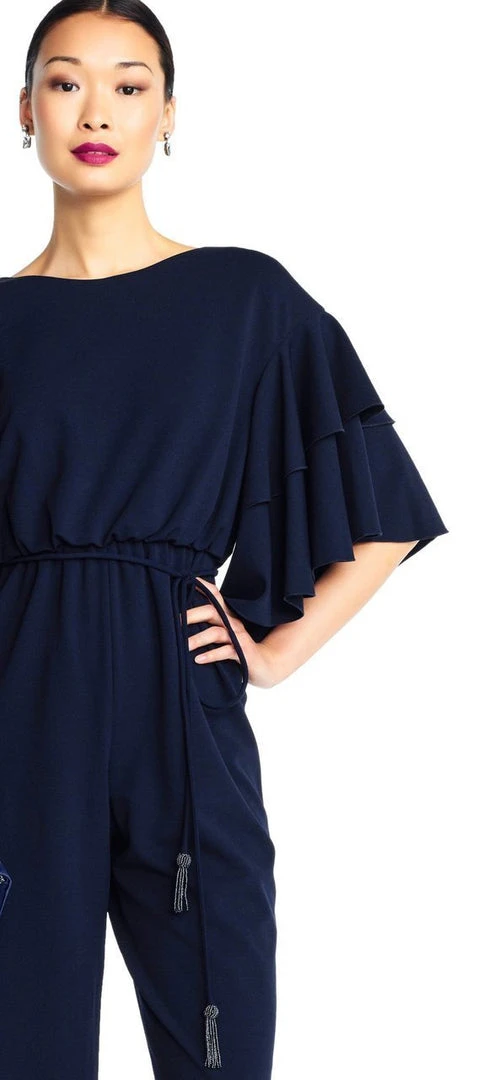 Express your unique personality through this creation by Adrianna Papell AP1E203073. Features a bateau neckline with flutter sleeves. The bodice is styled with a V-back and a tie waist. Completing the look, from the waist begins a full length pair of pants forming a jumpsuit silhouette. This Adrianna Papell design will definitely make you feel special!
