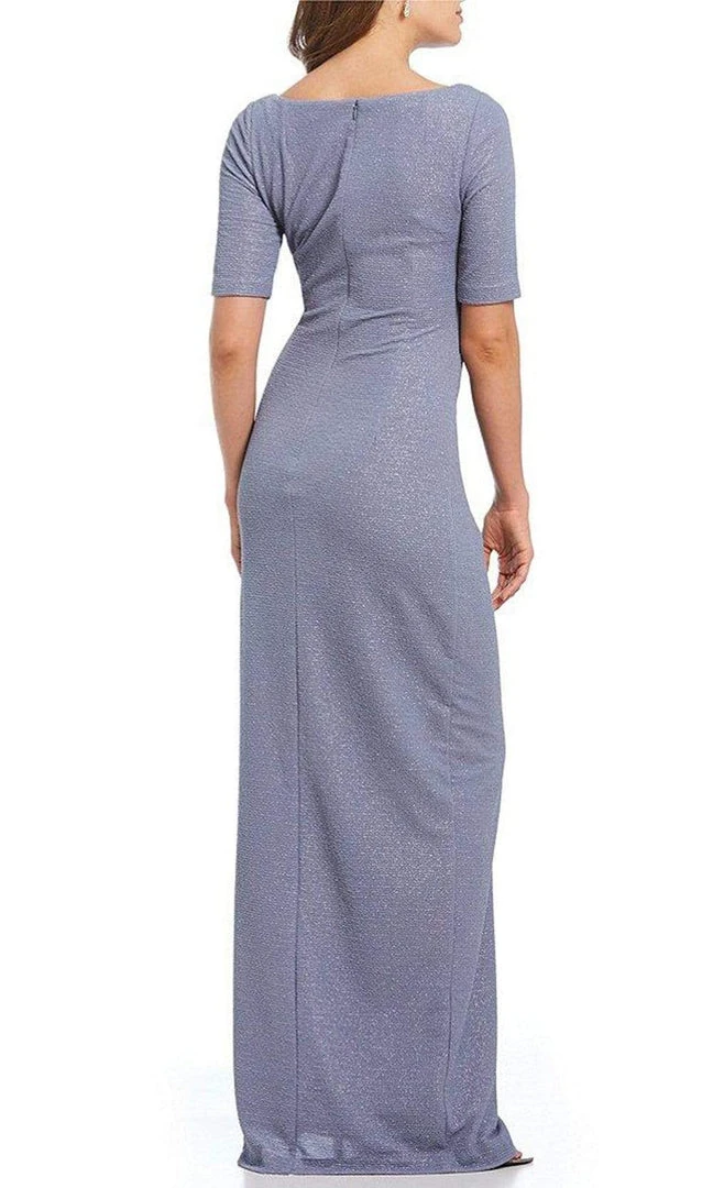 Brave the evening with temptress beauty and grace wearing Adrianna Papell AP1E203509. Appeals in a quarter length sleeve, V-neckline with fitted bodice styled in ruching. The back has a zipper closure and the column skirt flourishes towards the floor with a thigh high slit. You are statuesque in a posed gown from Adrianna Papell.