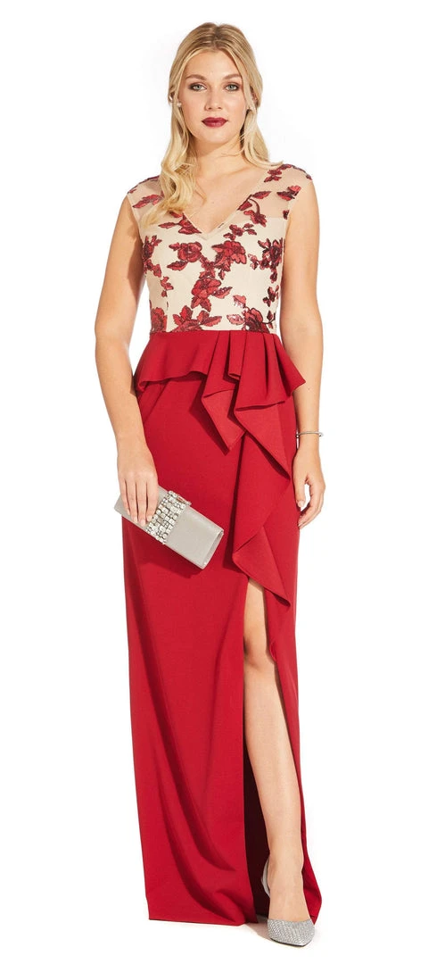 Show off your feminine side in this beautiful dress by Adrianna Papell AP1E204361. Striking sequin embellishments in floral pattern adorn the sheer bodice topped with a V neckline, complemented with a full zipped-up back. Cascading ruffles highlight the waist peplum accent as it continues to the side slit that accents the column silhouette. This Adrianna Papell outfit would present you as a chic and confident woman who always wants the most gorgeous and magnificent things.