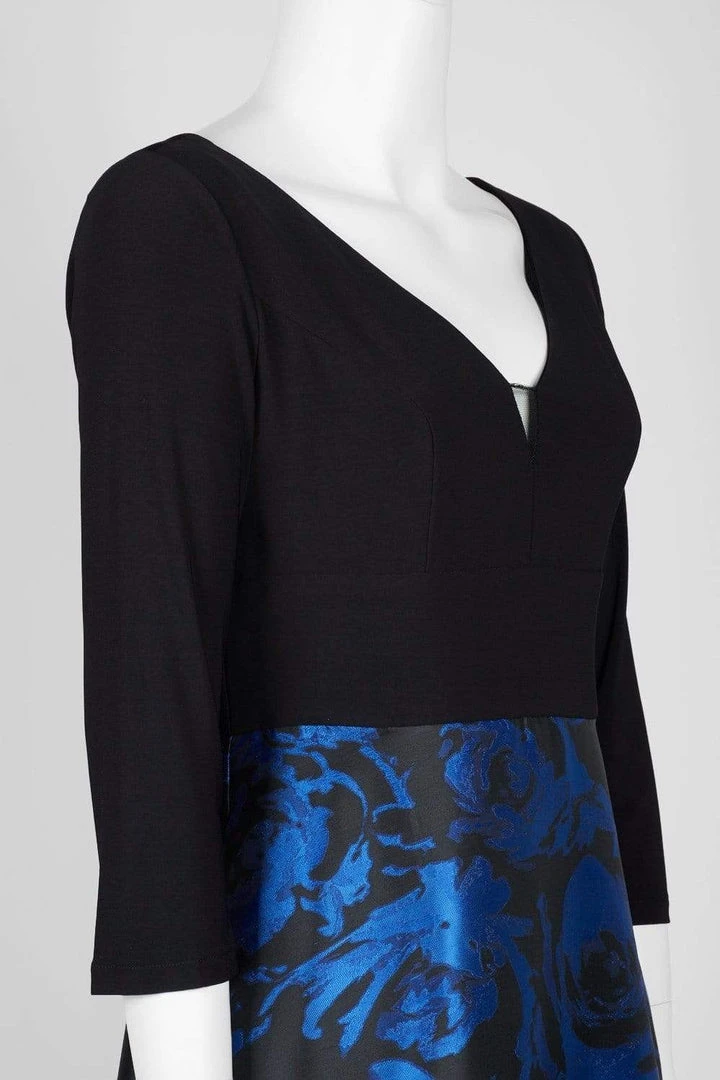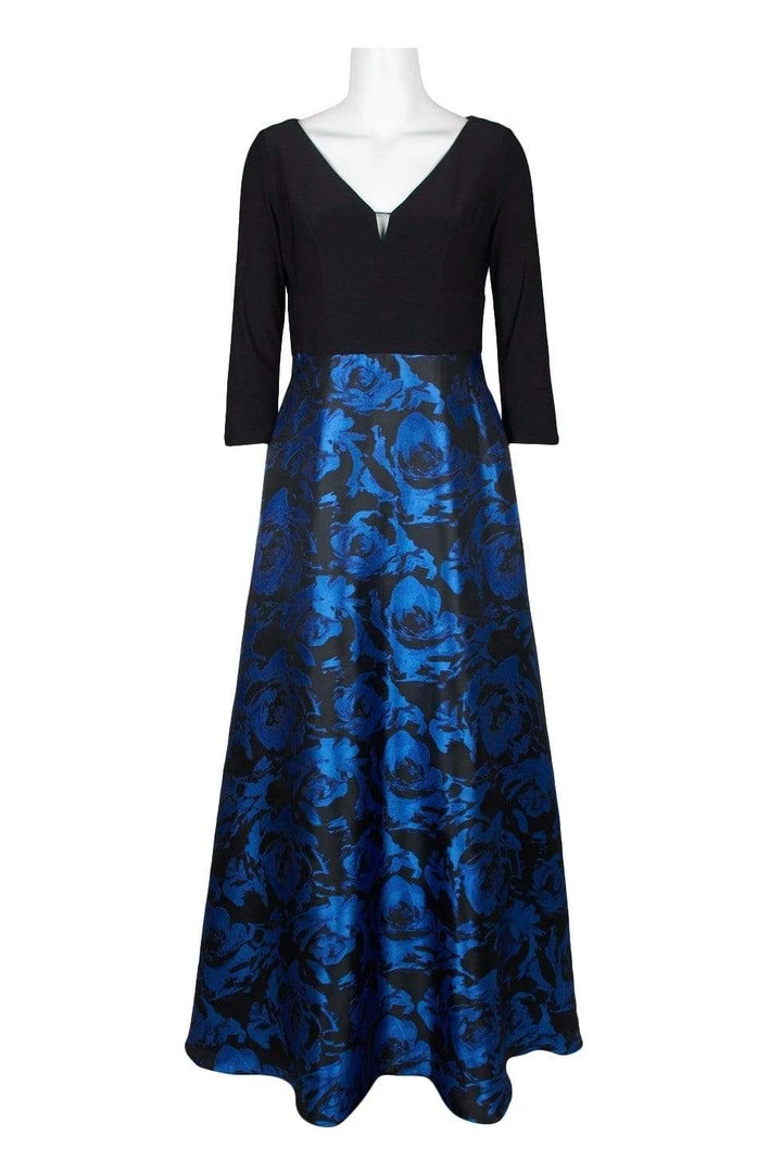 Be the spectacular belle on your next formal event in Adrianna Papell AP1E206803. This long dress has a jersey fitted bodice with a plunging V-neckline and a quarter length sleeves. The back has a zipper closure. The A-line skirt is made of floral print jacquard fabric and styled with pockets. This Adrianna Papell dress is sure to make you the darling of the party!