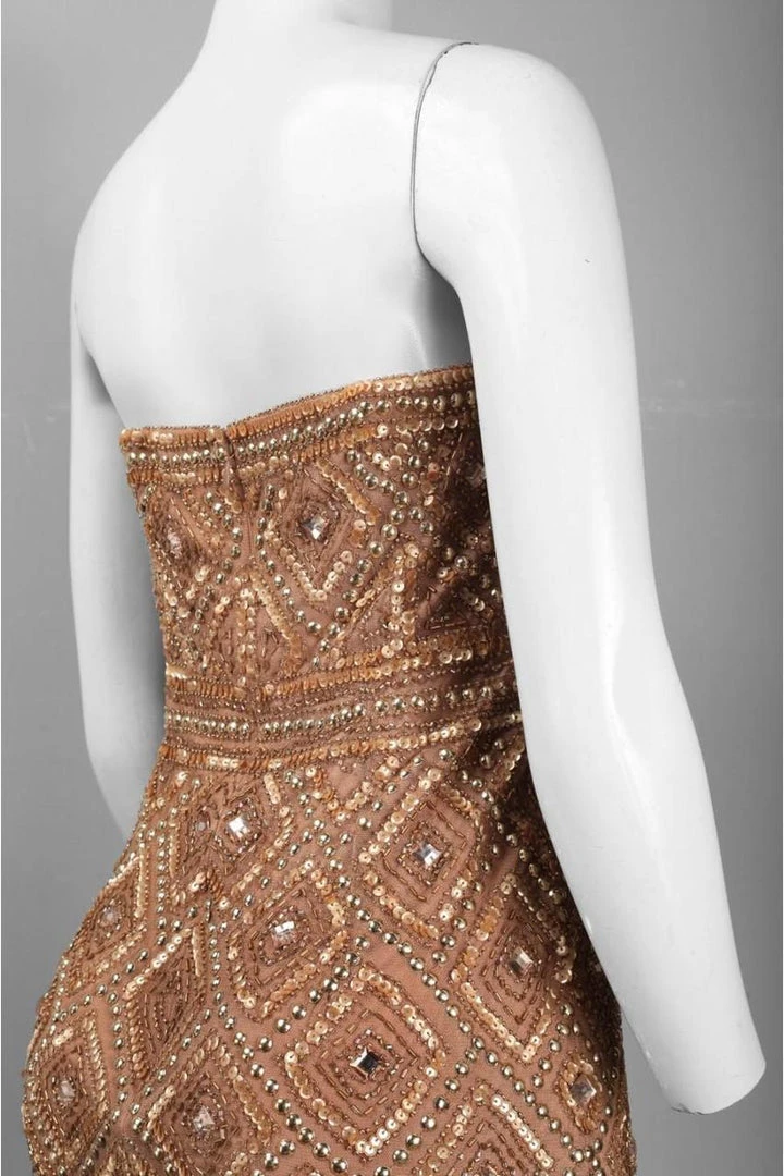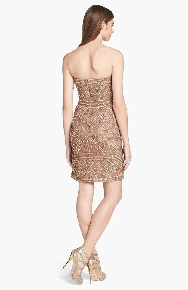 Be the center of attention in this glamorous dress by Adrianna Papell 41881470. This dress is embellished in stunning jewel and sequins in a tribal pattern. This strapless dress features a straight across neckline. Be ready to mesmerize the night in this dress by Adrianna Papell. Model is wearing Buff color.