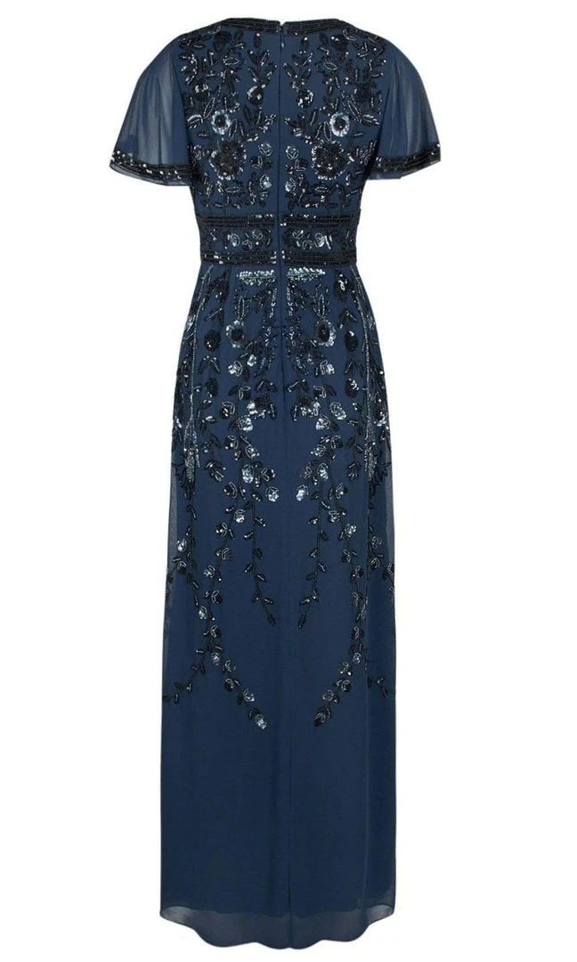 | Details: | Beaded Mesh, Short Flutter Sleeves, Zipper Back, Embellished |