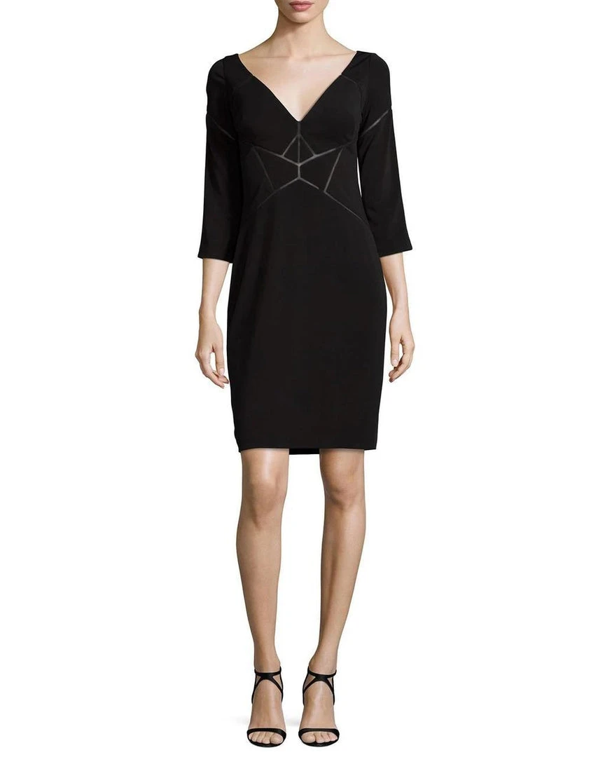 Show off your classy style when you wear this cocktail dress by Aidan Mattox MD1E200249. The jersey fabric dress showcases a v-neckline, three-quarter sleeve, and a back keyhole. The short skirt has a sheath silhouette. This Aidan Mattox creation is simply captivating!