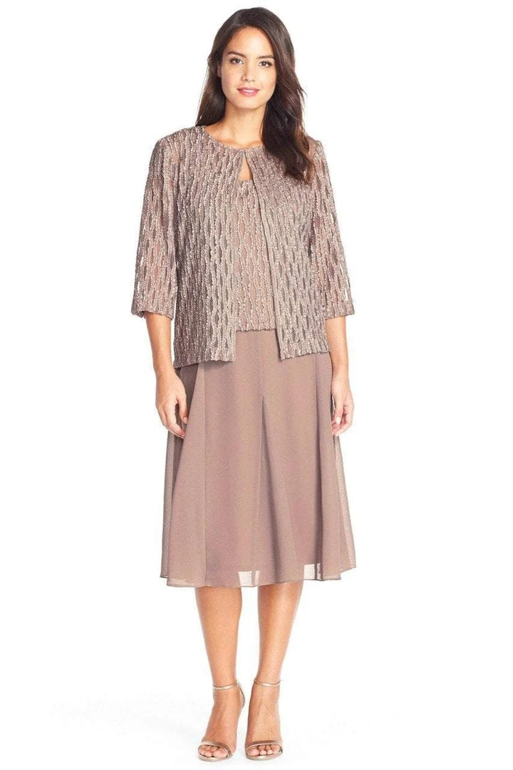 Look fantastic for your next formal event in this two piece set by Alex Evenings 117196. A ribbon-applique bodice tops a flowy chiffon skirt with godet insets that add romantic volume. A separate open-front jacket with coordinating ribbon detailing offers additional optional coverage. This Alex Evenings creation is simply perfect for your next formal party! Model is wearing Stone color.