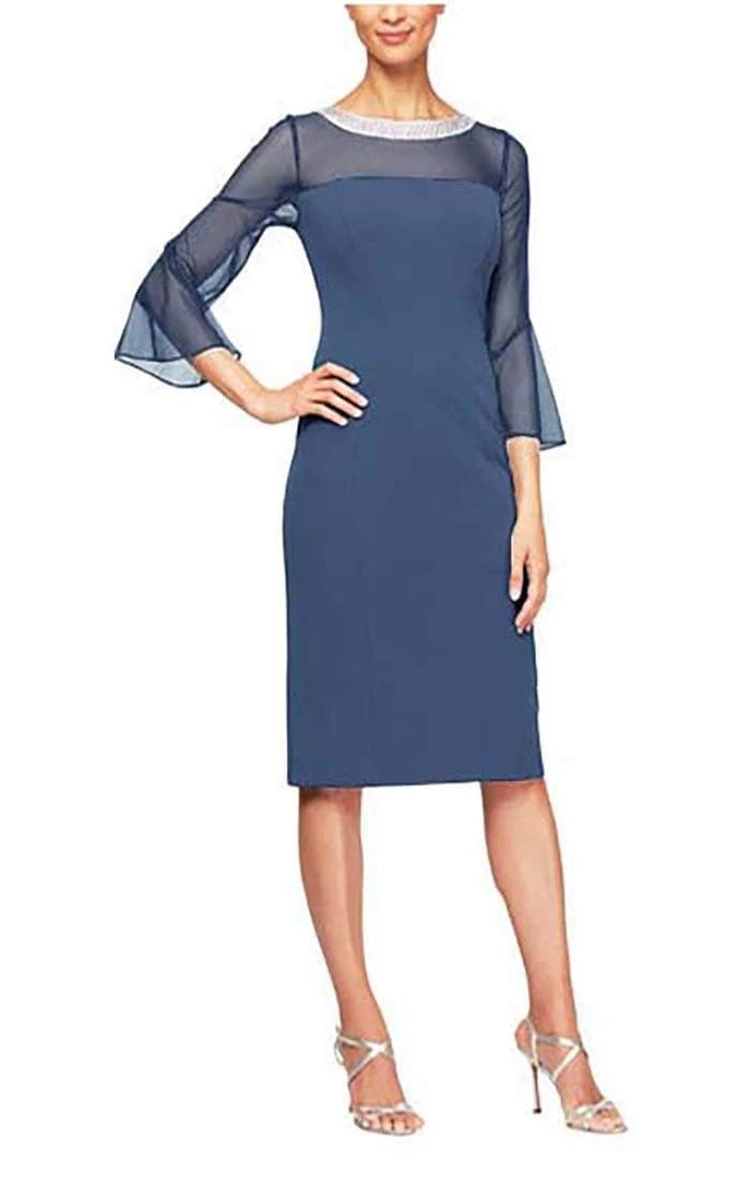 Look fabulously tailored while being rivetingly beautiful in this structured Alex Evenings 160146 cocktail dress. Sophisticatedly sculpted in solid crepe fabric, this gorgeous piece showcases rhinestone beaded illusion neckline with sheer yoke and three-quarter length bell sleeves. The dress is sculpted with seams for that much defined sheath silhouette, pulled together at the back with hidden center zip. The dress finishes with a straight, knee-length hem. This Alex Evenings creation is your excellent pick when you dare to look stylishly formal!