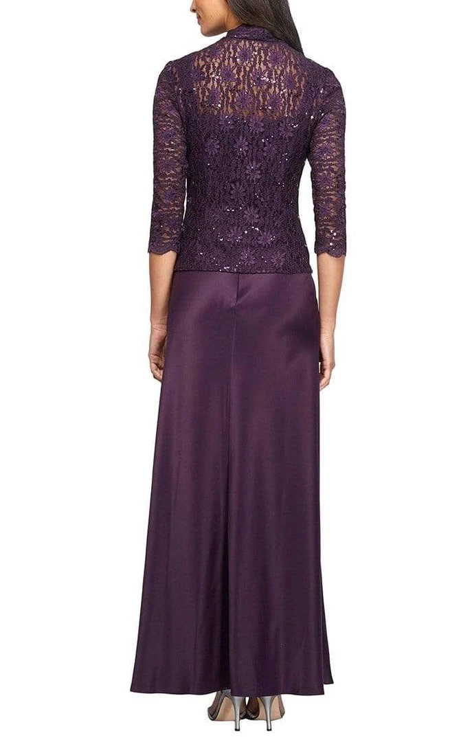 Be the spectacular belle on your next formal event wearing this Alex Evenings 2121198 evening gown. Sequin embellished lace, this stunner shows a square neckline on a sleeveless bodice. Designed with scalloped trim, the skirt reveals a chiffon A-line silhouette while the back shows a mid-open cut with zipper closure. The sheer quarter sleeve jacket features similar sequin lace details. This Alex Evenings style will definitely make you feel special!