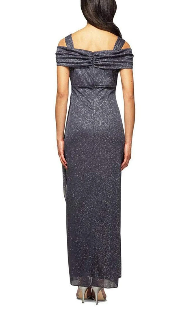 Elegant and effervescent, this glitter mesh long dress from Alex Evenings 233026 is a glamorous choice for next social event. This dazzling piece shows off a cold-shoulder style square neckline with wide pleated straps and drape sleeves, empire waist and figure flattering sheath skirt with drape side and slit for a more flattering silhouette. Be the loveliest of them all wearing this stellar dress from Alex Evening.