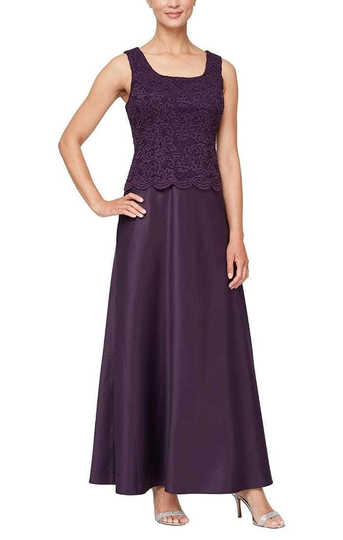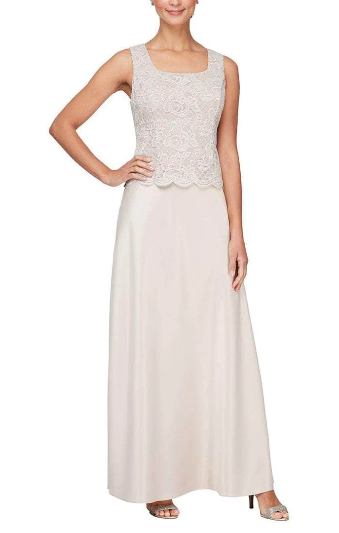Surround yourself with decadence in a dazzling ensemble from Alex Evenings 81122326. This long dress features a sleeveless, scoop neckline with a bodice styled with lace and a scalloped waist. The satin skirt is tailored in a full-length A-line silhouette. Enter the party and do that walk of a regal beauty in Alex Evenings.