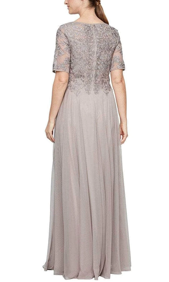 Get a taste of the spotlight when walking down the runway in this creatively delivered Alex Evenings 8132988. This one-of-a-kind fabulous piece is expertly encrusted with an intricate embroidered lace bodice with sprinkles of sparkling beads. Featuring short sleeves, V-neckline and a modest full back with a zipper at the center to give the ensemble a secure fit. The A-line silhouette of this gown accentuates your curves as it flows down to a full-length hem with comfortable lining. Dress in this Alex Evenings masterpiece and work your magic in a refined style! Model is wearing mocha, and Navy colors.
