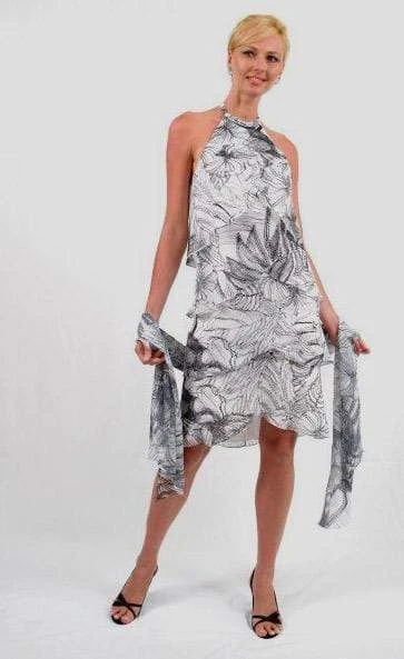 Mesmerize everyone as you walk the red carpet in this lovely dress by Daymor 9010! Features a sleeveless, halter neckline segues with jewel accents. The fitted bodice is styled with soft, overlapping tiers of material with subtle ruffled edges that creates a romantic feel. Make a splash in this short dress from Daymor.