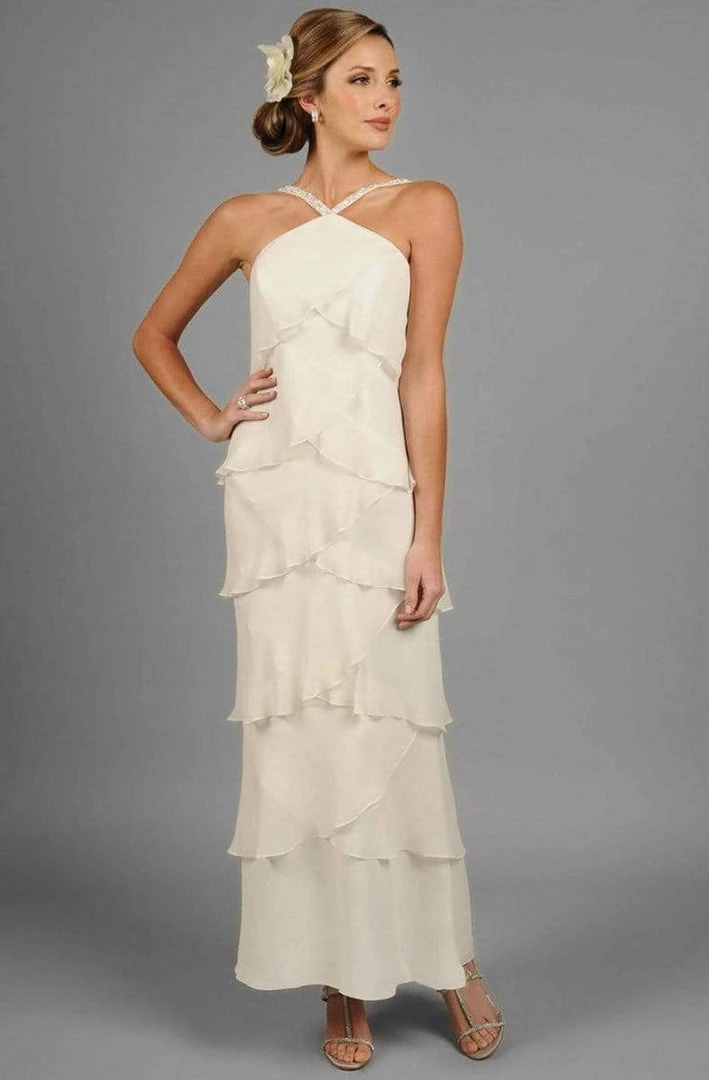This halter style dress with beaded straps features languid overlapping tiers of silk chiffon in classy column silhouette. The dress finishes at floor length hem.