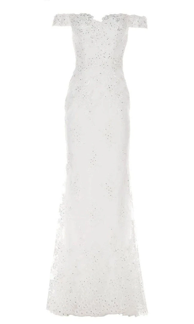 | Details: | Lace, Off-shoulder sleeves, Fitted bodice, Sheath skirt, Sweep train, Back zipper |