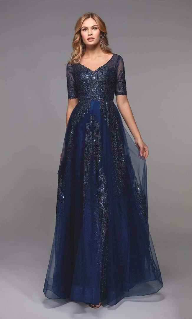 Walk in glamour and let all heads turn on you in this Alyce Paris 27493 evening dress. The fitted embellished bodice highlights a V neckline supported by half sleeves leading to a back keyhole with a back zipper finishing to an A-line full length skirt. Orchestrate your moment to stand out in this simple and elegant Alyce Paris creation. Model is wearing Navy color.