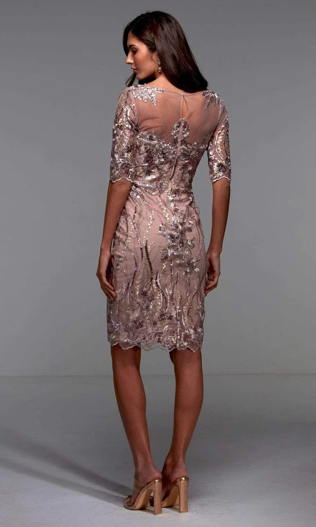 Enter the hall with grace and beauty in Alyce Paris 27531. This semi-formal fitted dress is designed with floral embroidery throughout and uses illusion neckline and quarter sleeves. Detailed with scallop hem and then uses back zipper as closure. Charm everyone from all angles as you shine all night long in this Alyce Paris masterpiece. Model is wearing Rosewood color.