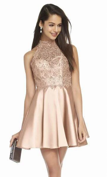 Inspire him to turn his head towards your direction as you saunter in confidence in this stylish Alyce Paris 3847 cocktail dress. This adorable sleeveless party dress brandishes in a high halter neckline and a fitted bodice crafted in sheer lace while the back boasts a flattering racerback styles with cutout details. The satiny Mikado A-line skirt flutters alluringly as it sways down to a short hemline. Impress the upscale crowd with your very presence in this Alyce Paris creation.