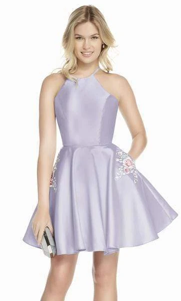 Make a splash at the party in a festive dress from Alyce Paris 3887. This homecoming dress is made of Mikado fabric featuring a halter neckline and cut-in shoulders while the open back allures with lace-up style. Classy floral embroidery ornate each side with hidden pockets. Short flared mini-skirt accentuates the legs. Be at your best in this Alyce Paris short flared creation.
