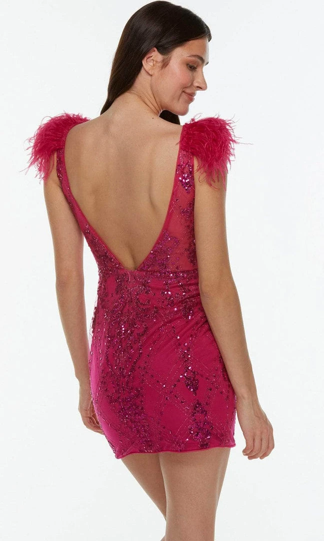 Be the spectacular belle on your next party wearing this Alyce Paris 4501 creation. This curve-hugging dress is fully adorned with glitter and sequin embellishment forming an exquisite pattern. It features a sheer bodice with a plunging V-neckline which has a sheer inset at the bust and the sexy back reveals a glimpse of skin with its low V-shaped cut for added sultriness. The breath-taking cap sleeves with feather detail give an amazing touch to this dress. The skirt showcases a fitted short sheath silhouette. Orchestrate your moment to stand out in this Alyce Paris design. Models are wearing the Light Mauve, Raspberry and Sand colors.