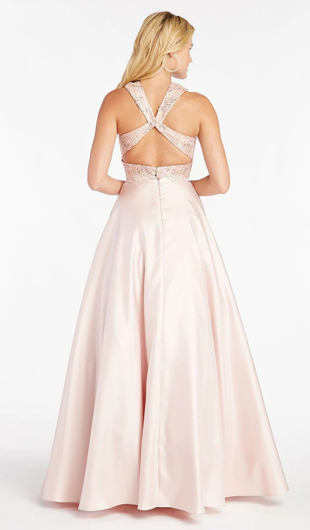 Fall in love when you slip on this Alyce Paris 60371 masterpiece. This shimmer Mikado gown fashions an intricately embellished cropped top with folded collared high neckline and cut-in shoulders, while the end is trimmed with scalloped shape edges. The back reveals a large crisscross embellished band at the center and a triangular cutout with hook and eye closure at the end. The skirt opens in a full A-line silhouette and runs at full length hem. Heighten your charming appeal with this Alyce Paris design. Model is wearing French Pink color.