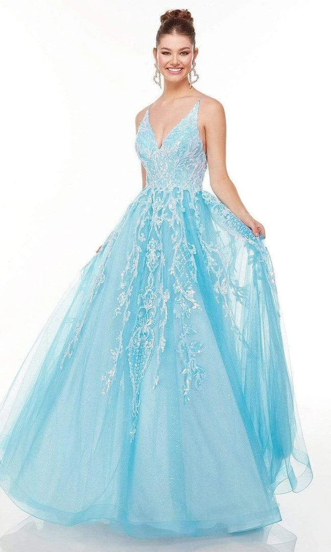 Draw out the princess in you with this Alyce Paris 61101 creation. This gown is fashioned in sequin embellishment with a sleeveless and deep V neckline bodice complemented with a strappy open back, followed by a center zipper closure. The skirt parades a ballgown silhouette which cascades to a full length hemline. Experience the outstanding effect in this design by Alyce Paris. Model is wearing a Blue Mist color.
