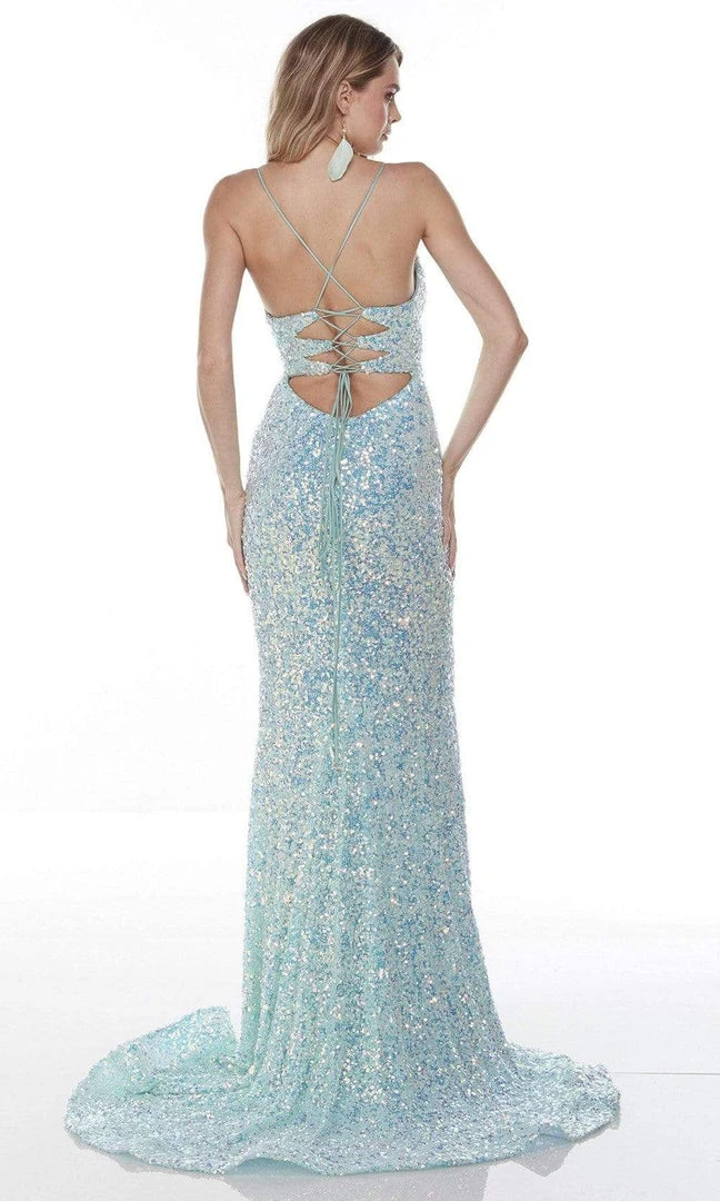 Promote attention-grabbing style in this stunning Alyce Paris 61115 creation. Shimmering sequins design the whole dress which provides the dazzling effect as the sleeveless bodice features a cowl neckline and spaghetti straps, flaunting a cutout style on its low back and a lace-up bandeau strap. The full length trumpet skirt finishes in a sweep train for added drama. This Alyce Paris masterpiece will make you feel all royal and radiant looking. Model is wearing Mint Opal and Rose Opal colors.