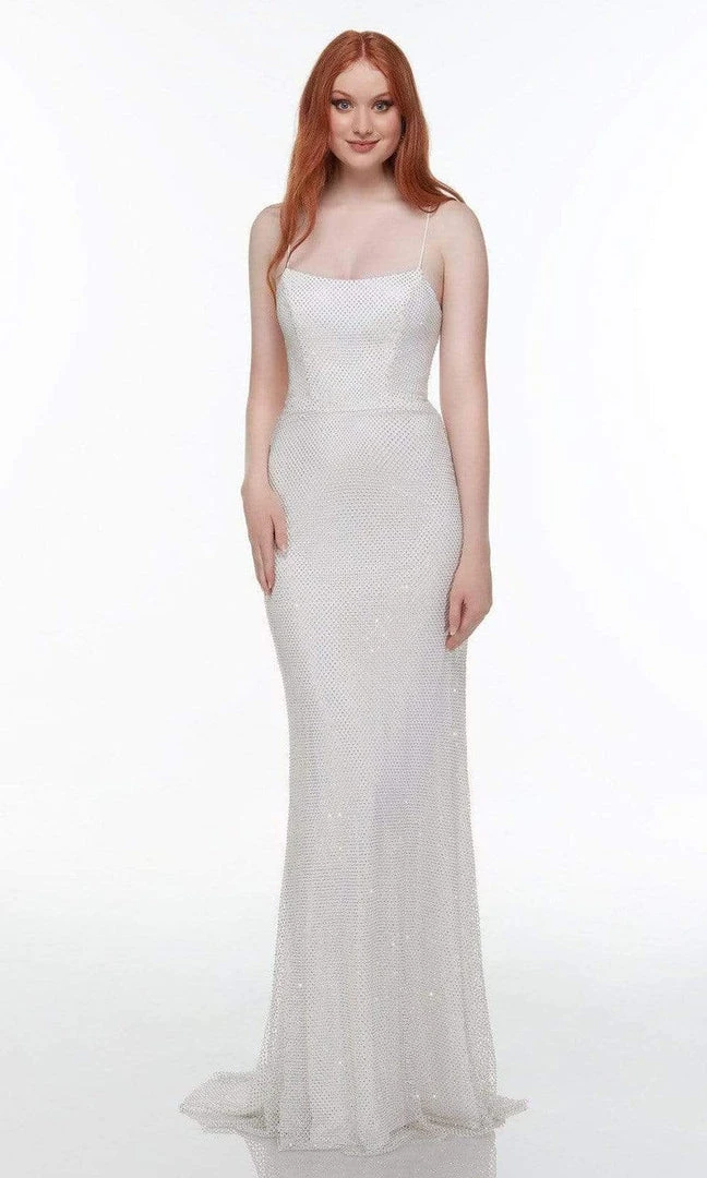 Flourish immaculate elegance in this Alyce Paris 61123 creation. Textured with a lattice motif silhouette, this gown flaunts a scoop neckline with spaghetti straps. Rendered with a lace up back, the sheath skirt streams to pool with a train. Bring about an utterly enchanting style in this Alyce Paris masterpiece.