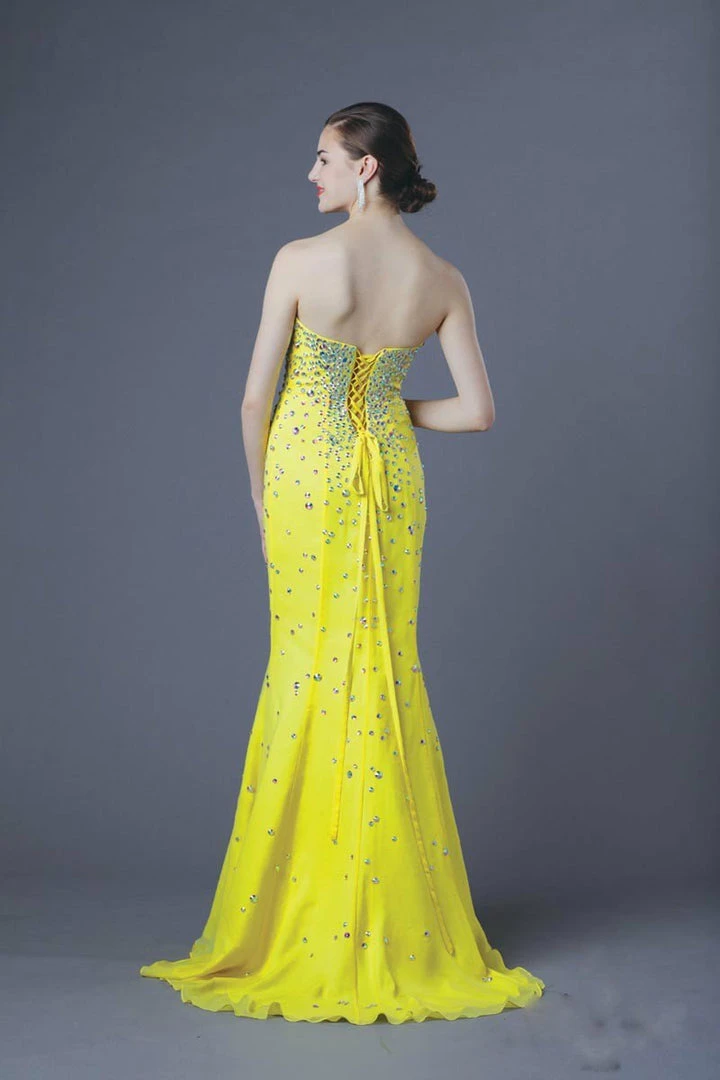 Strapless sweetheart neckline velvet chiffon long mermaid gown featuring heavily beaded stud stones on bodice and cascading down to hemline and a lace-up back.