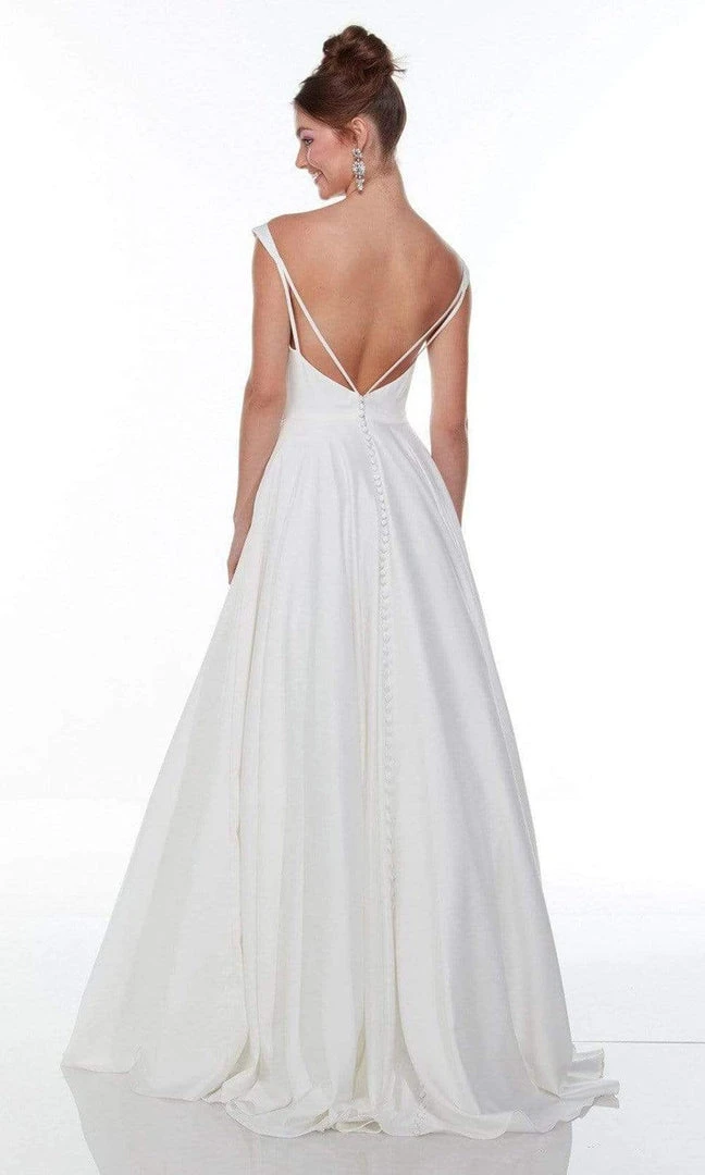 Get a timeless and trendy look in this sophisticated wedding gown in Alyce Paris 7054. Cut with an elegant bateau neckline, this stunning gown is styled in a minimalist fashion. The A-line skirt is adorned from behind with a line of buttons extending from the hem up to a low back. Sway to the music on your special night wearing gorgeous Alyce Paris. model is wearing White dress color.