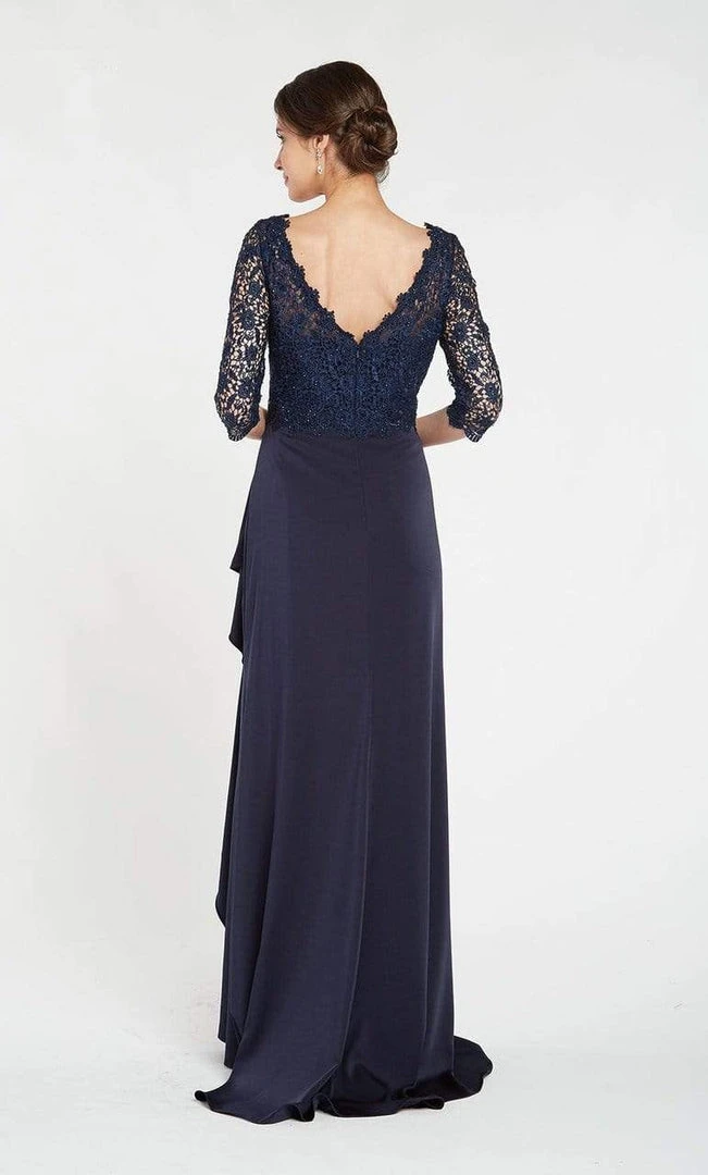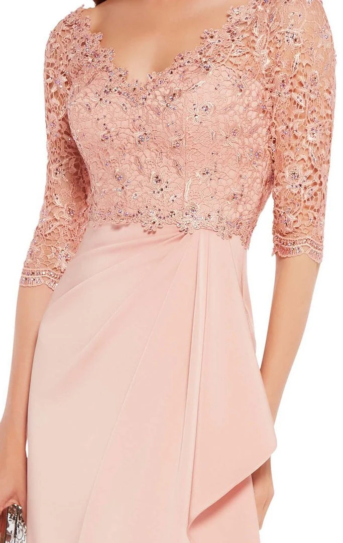This immaculate ensemble features twinkling tiny beads on delicate lace fabric, in a fitted bodice framed with v-illusion over a sweetheart neckline and slender sheer quarter sleeves. The back reveals a wide v-cut shape as the lace scallops along the natural waist. The floor-length sheath skirt drapes with soft pleats that texturize its glamorous faux wrap design with a flowing cascade.Â