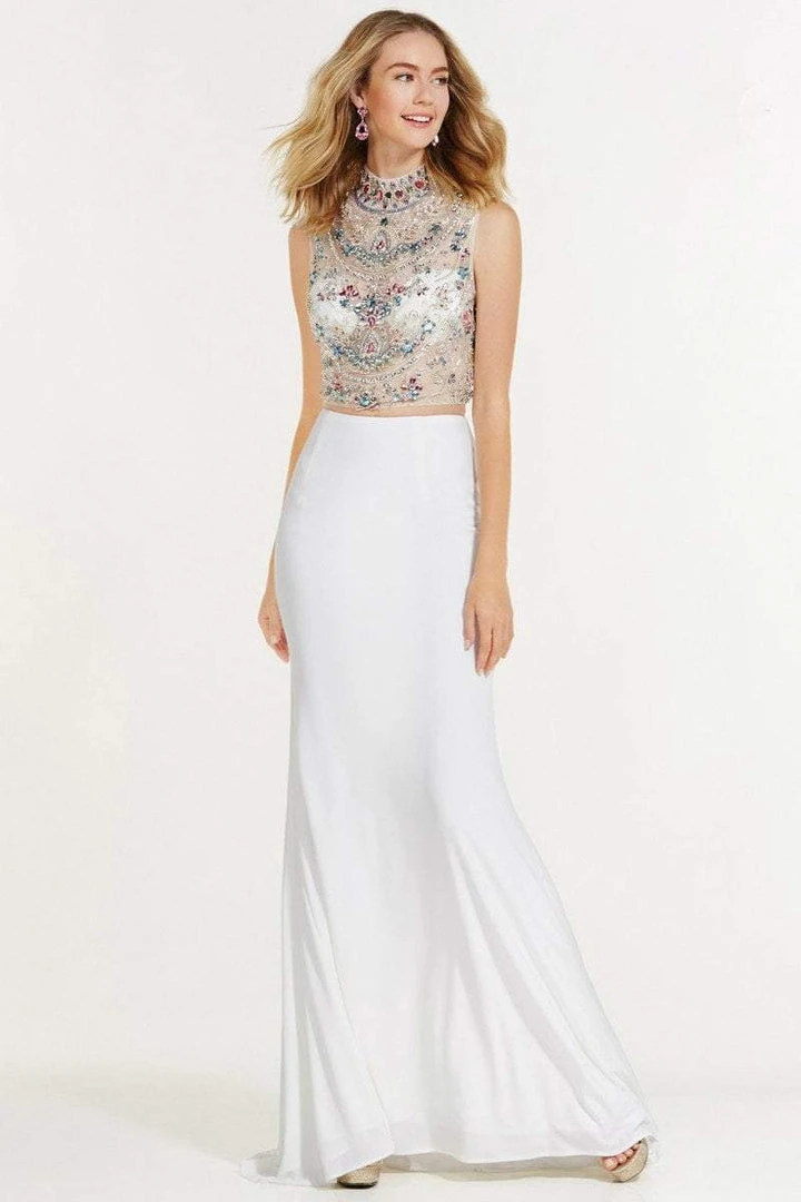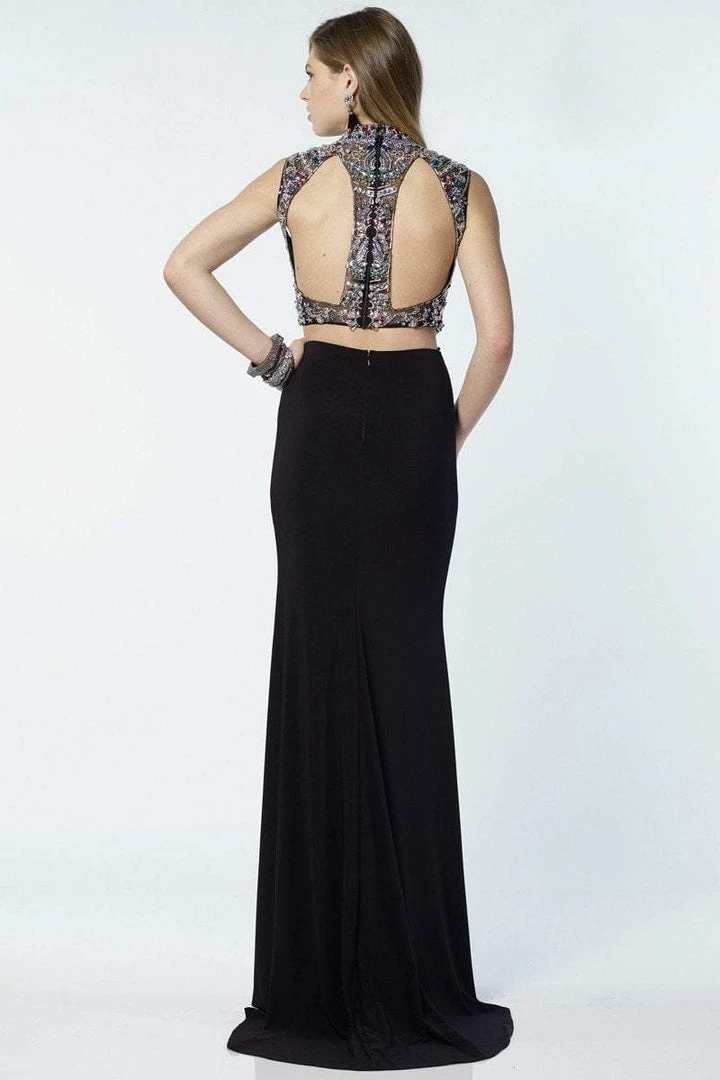 Slim jersey skirt, high neck embellished crop top and two keyholes in the back.