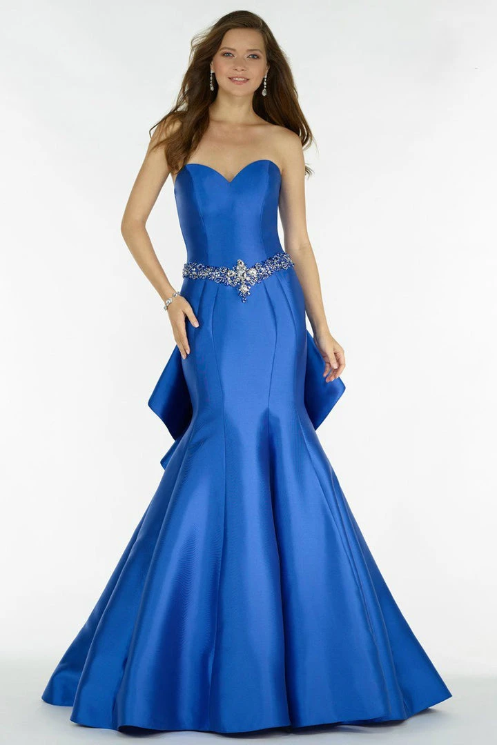 Mikado trumpet gown, sweetheart neckline, embellished waist belt and ruffled back.