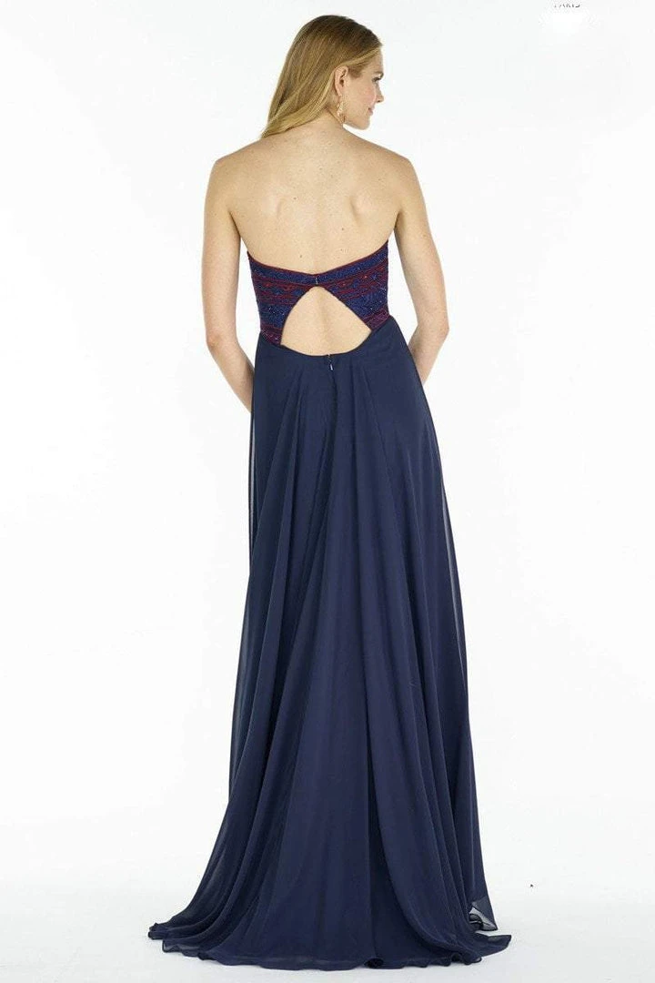 Flowy chiffon gown with a semi sweetheart neckline, embroidered bodice and a small back keyhole.