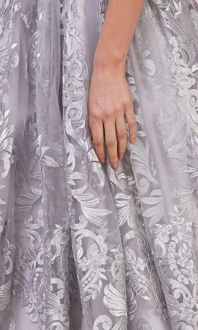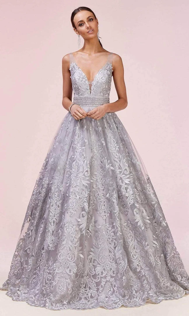 Be the lady of the night in this gown from Andrea and Leo A0620. This stunning gown features a sleeveless, deep V neckline with sheer inset at mid-bust. Designed in embroidered lace, the gown has a back zipper closure and a beaded belt. The skirt opens in a voluminous ballgown silhouette and finishes in a scalloped hemline. This Andrea and Leo creation is simply breathtaking!