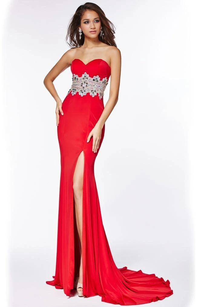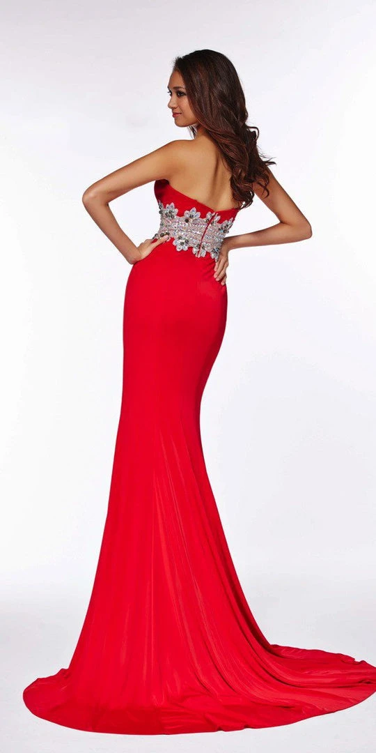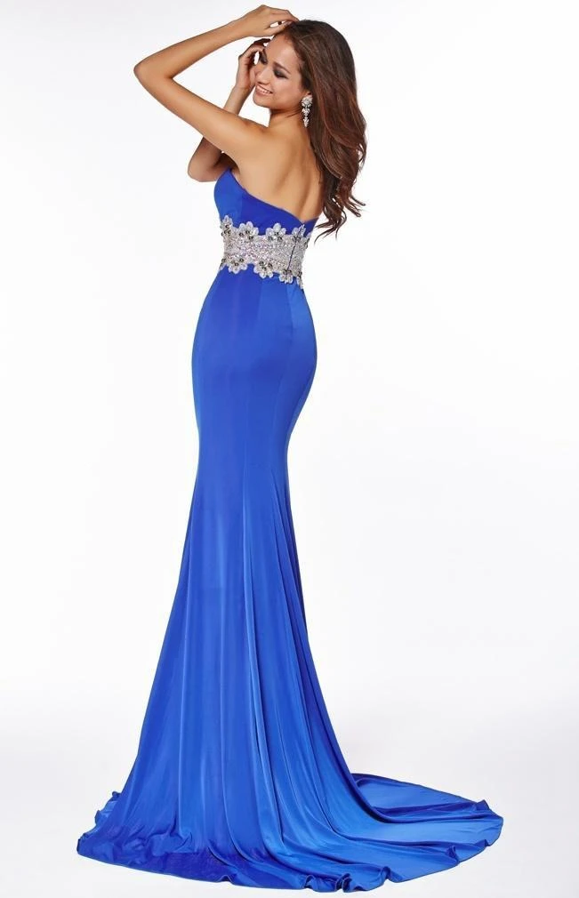 Fascinate friends and family alike with the details of this formal dress. It has an embellished waistline, is strapless, form-fitting and floor-length. The spring collection created a smooth, and youthful dress capable of turning heads at any special occasion.