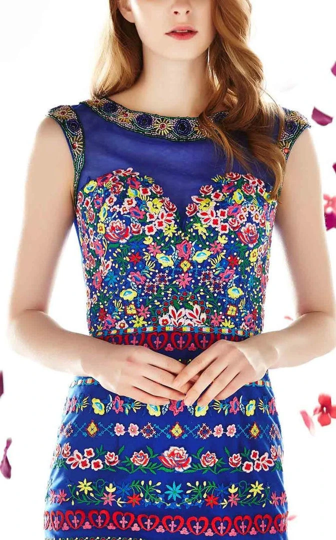 | Details: | Cap sleeves, Beaded, Floral embroidery, Back cutout, Back zipper closure |