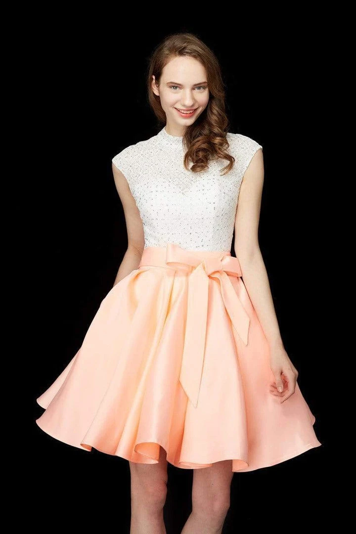 | Details: | Beaded Bodice, Sleeveless, Wide Waist Bow, Pleated Skirt, Mid-Thigh Length Hem, Heart Shape Back Hole, Back Zipper Closure |