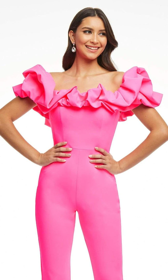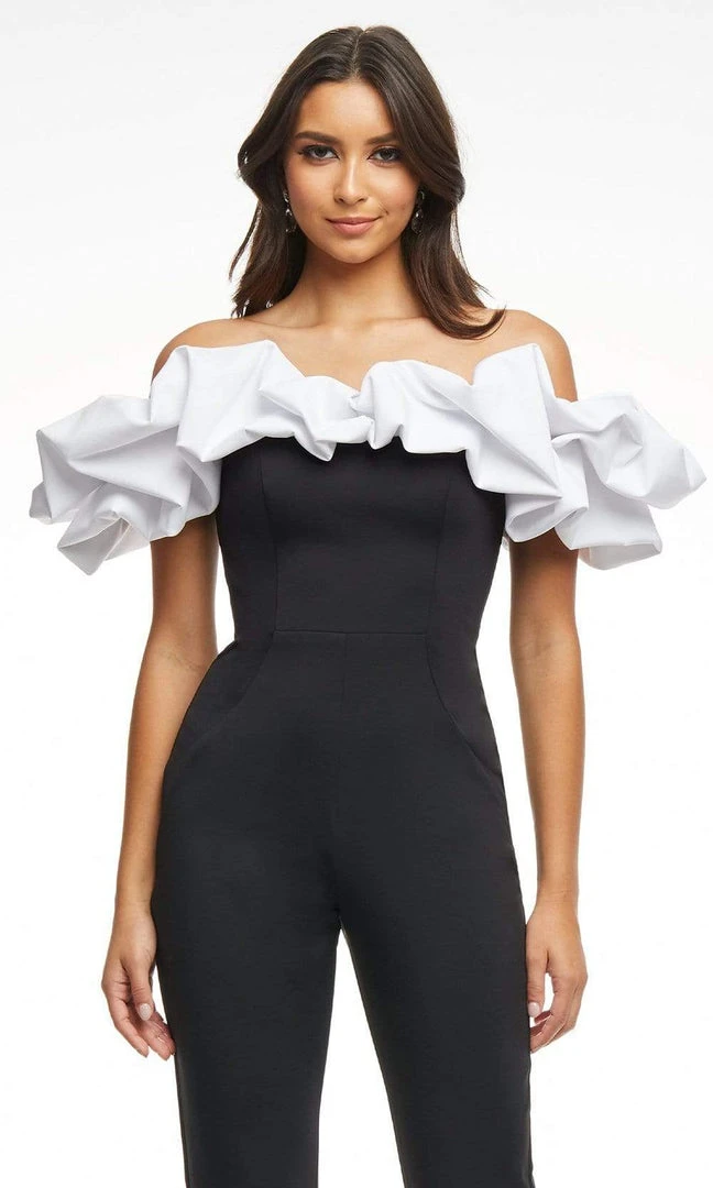 Dress to impress on your next formal event in this simple but captivating Ashley Lauren 11058 jumpsuit. This jumpsuit highlights a ruffled off shoulder neckline in a fitted bodice with princess seams. This also shows a mid-open back to complete the full length look. Be ready to catch everyones eyes in this Ashley Lauren design.