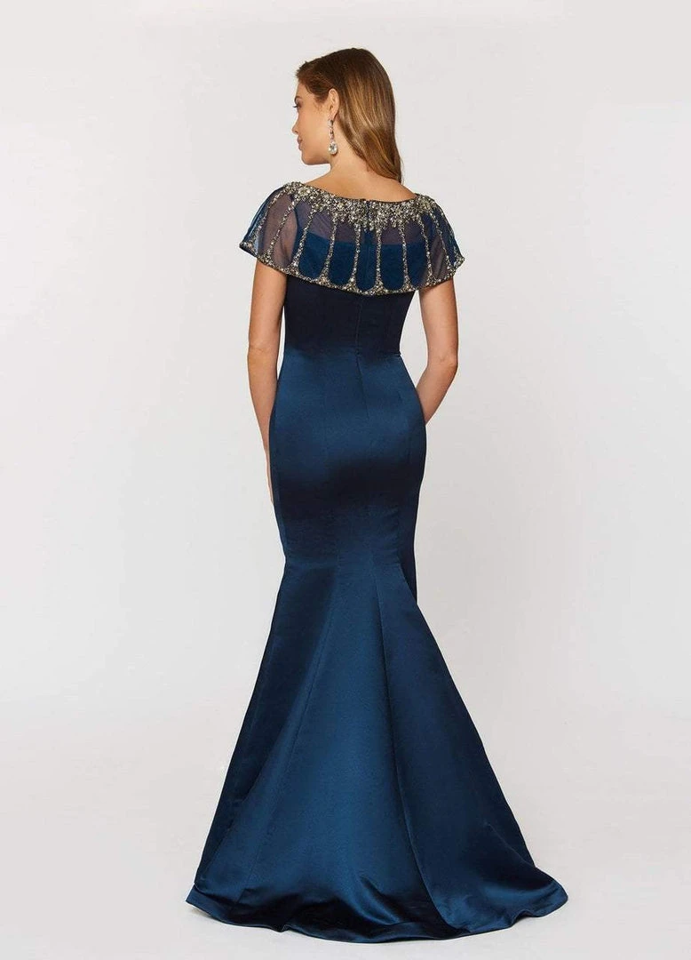 Wow the crowd in this elegant evening dress by Ashley Lauren 1201. The illusion neckline is encrusted with pewter & pearl beading that flows from front to back. The intricate beading and trumpet silhouette are sure to flatter your curves. Make it your moment to shine in this lavishly embellished evening gown by Ashley Lauren.