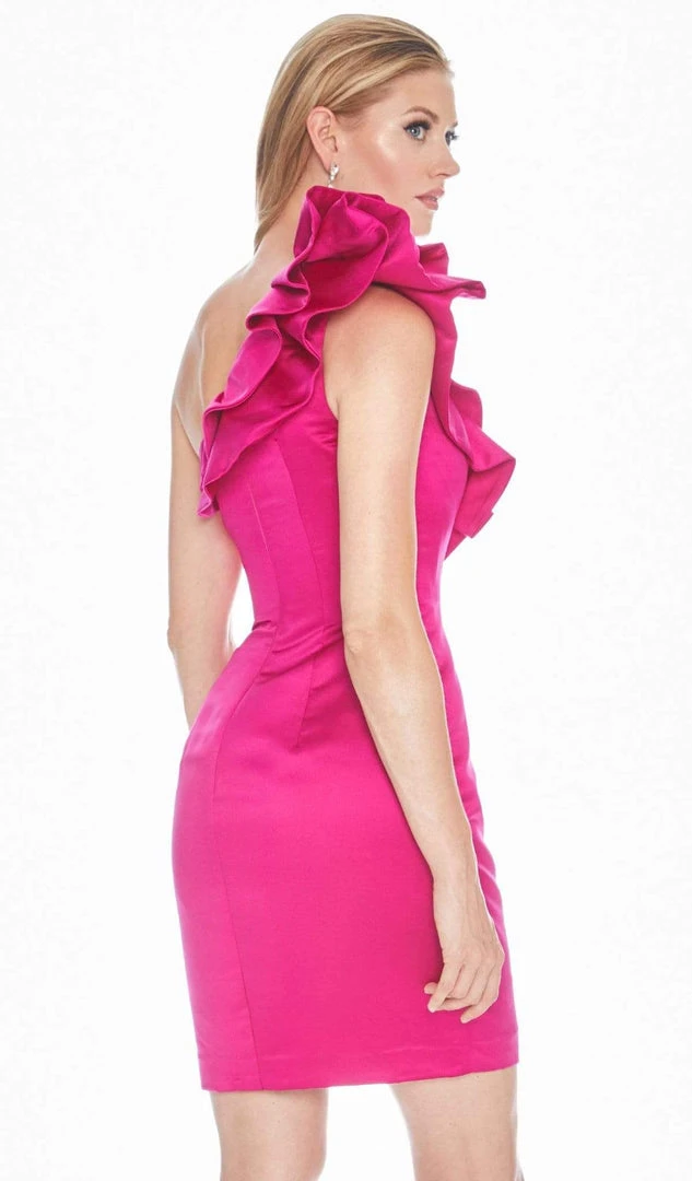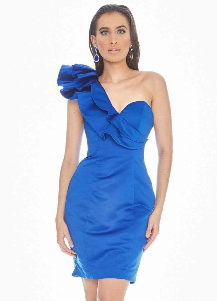 Flaunt your figure and make a statement with this cocktail dress by Ashley Lauren 4172. Fashion a sleeveless, sweetheart/neckline with one shoulder detailed with a ruffle accent at the bust. The fitted bodice gives way to a sheath skirt in mid-thigh hem. This Ashley Lauren dress is a brilliant pick for any special party.