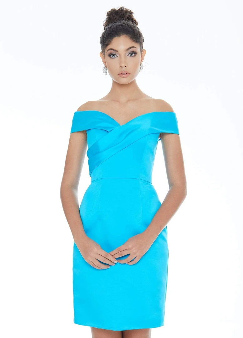 Make a glamorous statement at your homecoming with this sophisticated Ashley Lauren 4291 cocktail dress. The fitted bodice showcases a modern off -shoulder bustier neckline with wrap pleating, complemented with a mid-open zipped up back. From the seamed waist, reveals a column skirt that cascades above the knee hemline. Simplicity and elegance is defined in this Ashley Lauren piece. Model is wearing Turquoise color.