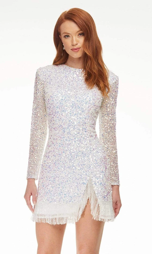 Get noticed in this radiant dress from Ashley Lauren 4438. This beaded cocktail dress pleases a jewel neckline with long sleeves. It has a flattering fitted bodice and a short skirt with a fringe hemline. Be strikingly gorgeous in Ashley Lauren.
