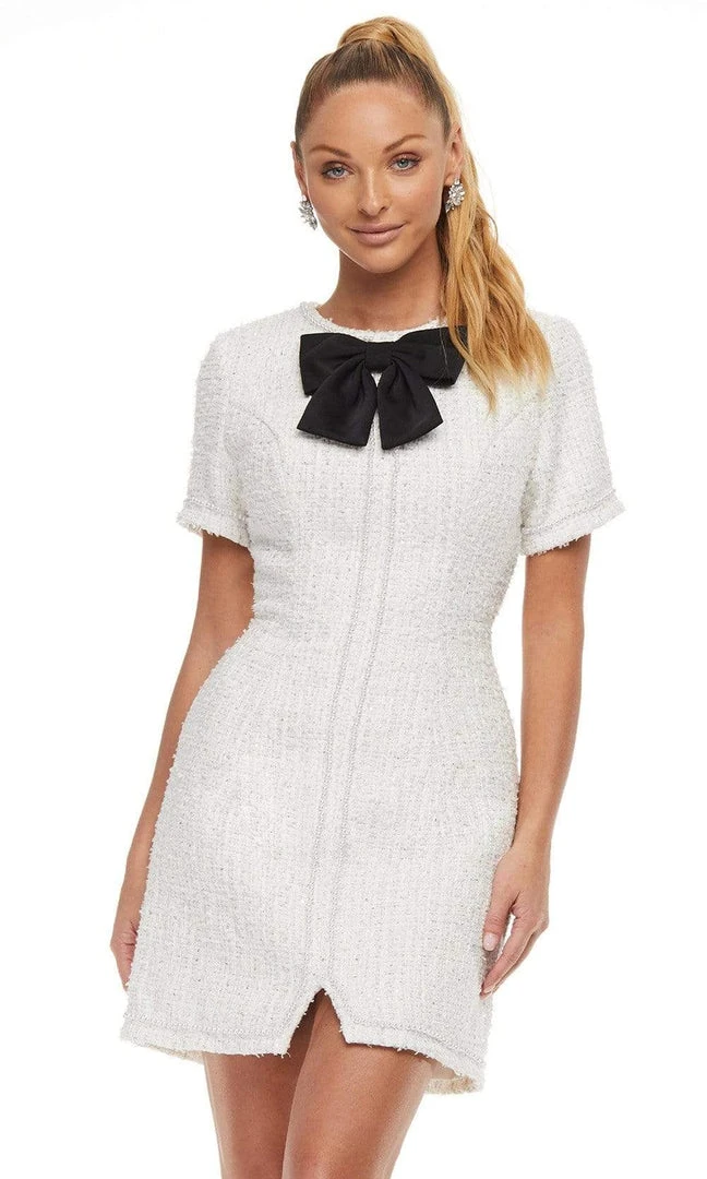 Classy and elegant, this short Ashley Lauren 4472 dress is perfect for your next event. This dress features a jewel neckline in a fitted bodice with princess seams, pearls, and front ribbon accent. The skirt reveals a sheath silhouette while the back shows a full back to complete the look. Impress the crowd with your charm as you wear this lovely creation from Ashley Lauren.