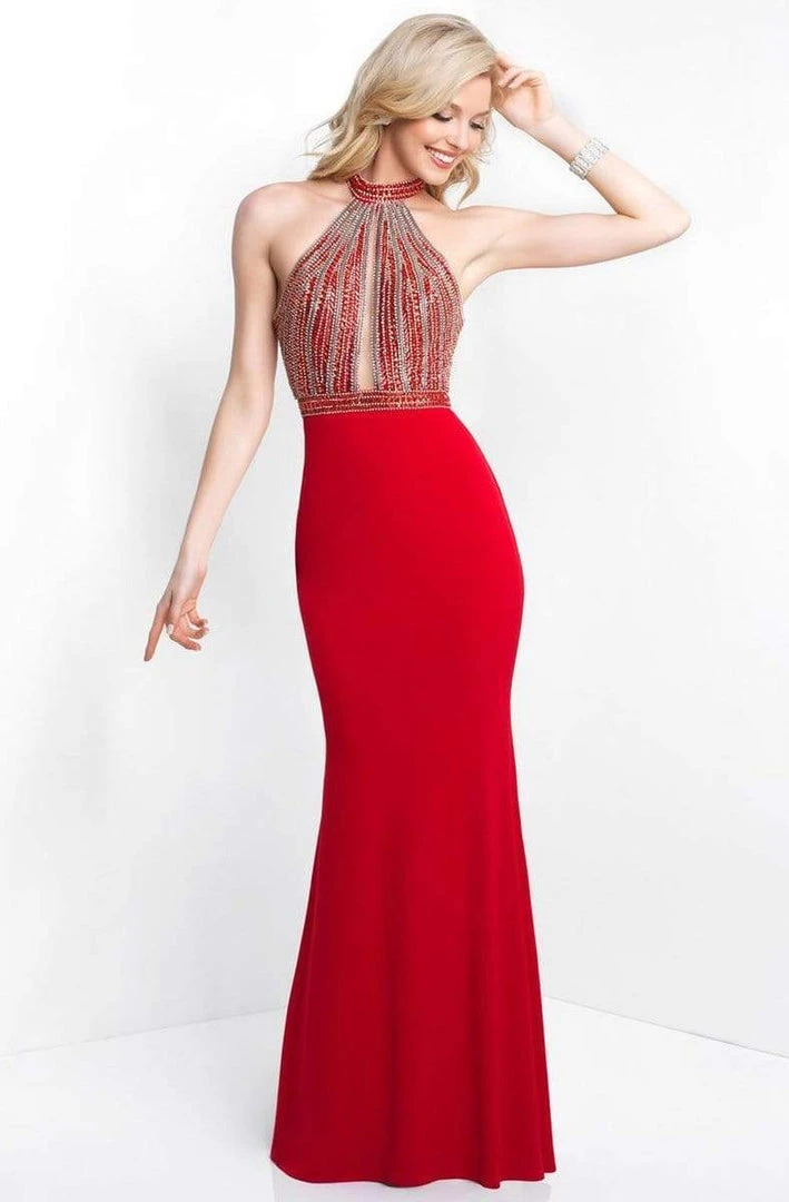 Be a certified heartbreaker as you look so enticingly sophisticated in this glamorous Blush 11502 creation. Iridescently flourishing with streak motif beadwork topped with a plunging keyhole cutout, this charmer shows a high halter neckline coupled with a racerback with flaring straps. Amazingly bejeweled around the natural waist, the sheath skirt softly streams down to an impeccable full-length hem and a sweeping train. Look mesmerizingly opulent at your special event in this standout Blush masterpiece.