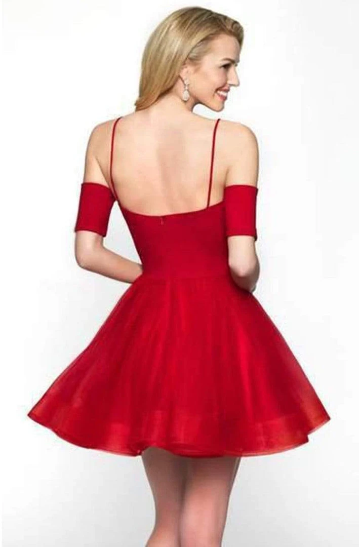 Get glamorous look with this dress by Blush 11618N. Graces in a straight across neckline with spaghetti straps and short off-shoulder sleeves. The fitted bodice is made of jersey fabric and is accented with visible seams and a zipper closure. The tulle A-line skirt runs at mid-thigh and has a horsehair hemline. This Blush creation is simply captivating! Model is wearing Valentine color.