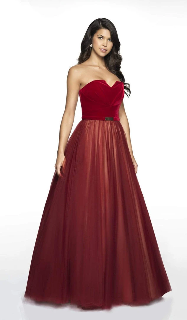 Promote attention-grabbing style in this stunning design by Flair Prom 19029. Brandishes in a strapless, V-neckline with fitted bodice made of velvet. The waist is wrapped in a belt and the back features a zipper closure. This two tone gown flourishes a tulle ballgown skirt. Go with fun, gorgeous, and youthful look by Flair Prom.