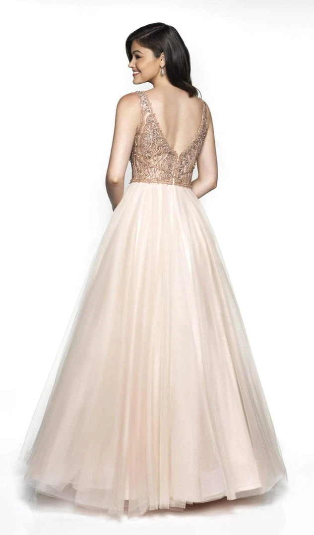 Shimmer all night long in this stunningly phenomenal Flair Prom 19210 creation. Beaming with radiant stones and shimmering beadwork on a sleeveless bodice, this beauty shows a plunging sweetheart neckline with an illusion modesty inset. Gorgeously embellished with crystals on a sheer v-open back, the A-line skirt revels in gossamer tulle layers that touch the floor with a full-length hemline. Lead this spectacular event in divine elegance in this Flair Prom masterpiece. Models are wearing the Blush and Silver colors.